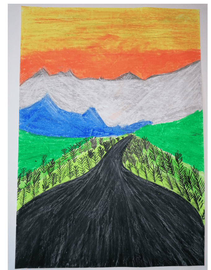 De tekening stelt Oostenrijk voor. Oostenrijk is voor mij een land van vrijheid, natuur, kleur, goede lucht. Als je daar bent ben je precies een andere nieuwe persoon. Het liefst van al zou ik daar nu willen zijn en mijn vrienden daar terug willen zien. Of een goed ritje maken met de auto tussen de bergen. Dat is zo rustgevend. Wandelen op paden tussen de bomen en in de verte mooie grote bergen voor je zien dat geeft een goed gevoel. Als ik daar wandel kan ik nooit opgeven altijd van de ene rots naar de andere en ik wil zeker de punt bereikt hebben.